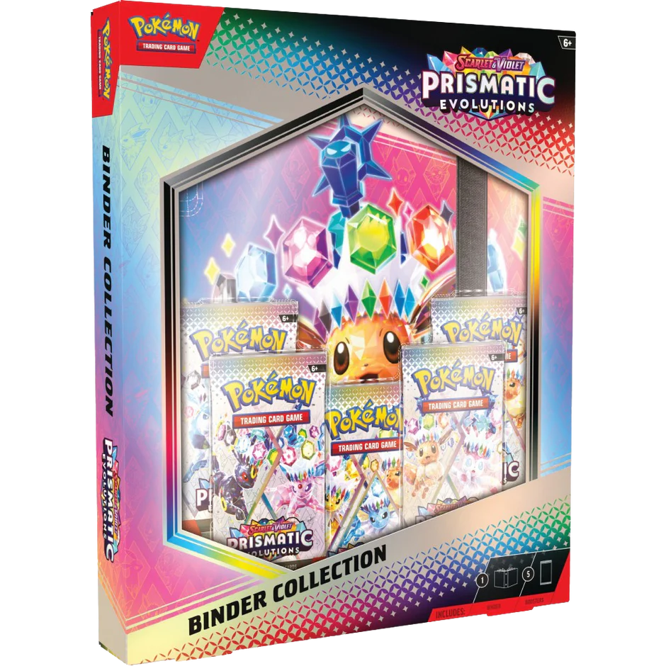 The Pokémon TCG: Scarlet & Violet—Prismatic Evolutions Binder Collection includes: • A binder with 21 9-pocket pages • 5 Pokémon TCG: Scarlet & Violet—Prismatic Evolutions booster packs